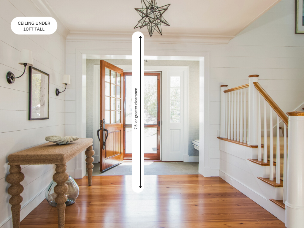 For ceilings under 10 feet, a clearance of 7 to 7.5 feet below the fixture is generally recommended to provide ample clearance for anyone in the space.