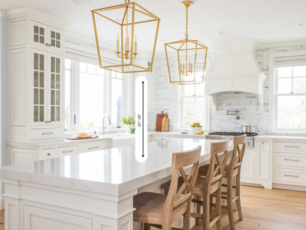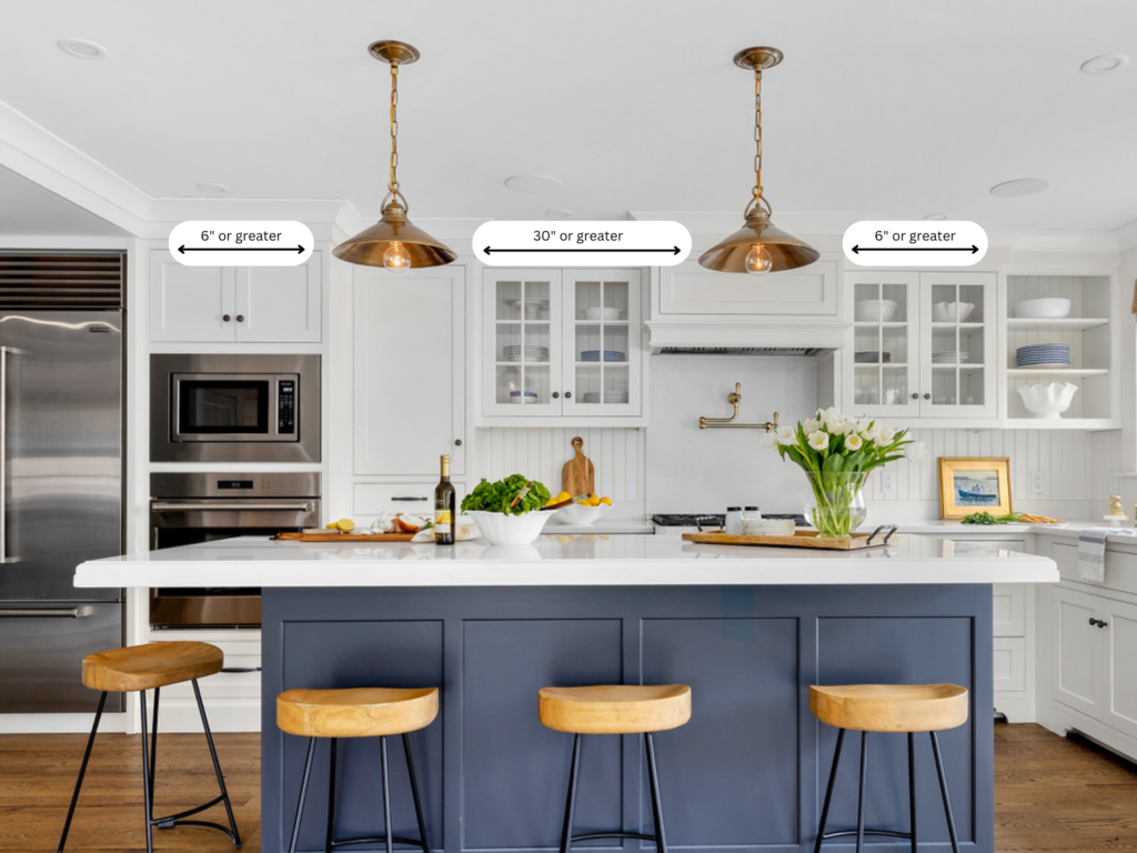 For standard eight-foot ceilings, hang pendant lights or other fixtures 30 to 36 inches above your kitchen island. For every additional foot of ceiling height, add two or three inches to maintain the desired distance. If you’re using multiple fixtures, ensure the widest part of each fixture is approximately 30 inches apart, and leave at least six inches of space on either side of the island for a balanced and aesthetically pleasing look.