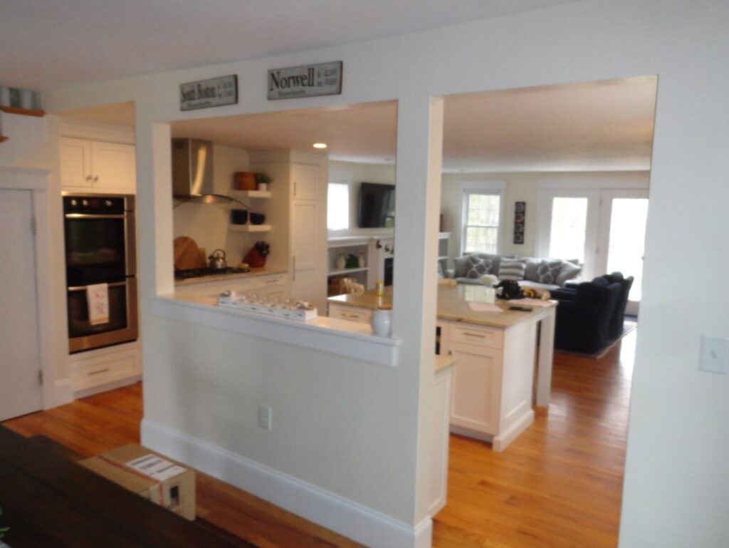 The new living room space in the Norwell house project is an integral part of our client’s addition, a transformation that has redefined the layout of their home. With this innovative change, they’ve allowed the kitchen to expand and take over the area that used to serve as both the kitchen and living room.