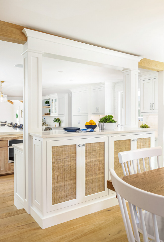 Additionally, the raffia-paneled doors infuse a coastal ambiance, bringing the gentle, organic textures of the seaside into the heart of the home.