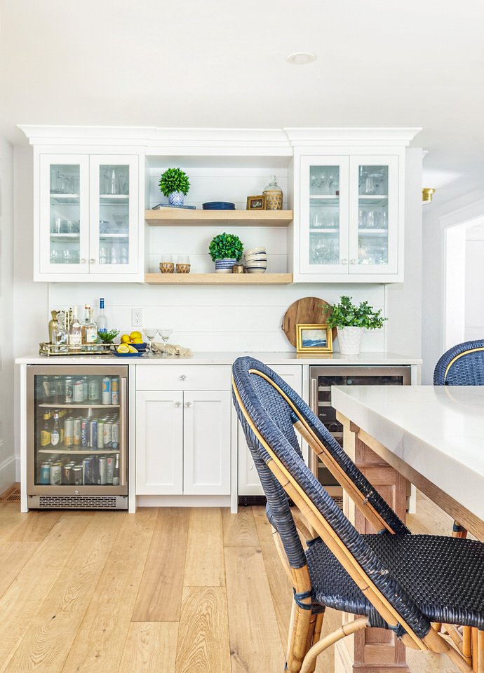 The dry bar area in the Norwell house project is a sophisticated addition, combining convenience with elegant aesthetics. Featuring two built-in mini-fridges dedicated to wine and beer storage, it ensures that your favorite beverages are always perfectly chilled and readily available. The glass cabinets not only provide easy access to stemware but also serve as a decorative focal point. This multifunctional space seamlessly integrates into your kitchen, offering a stylish and functional spot for entertaining and enjoying your favorite drinks with friends and family.