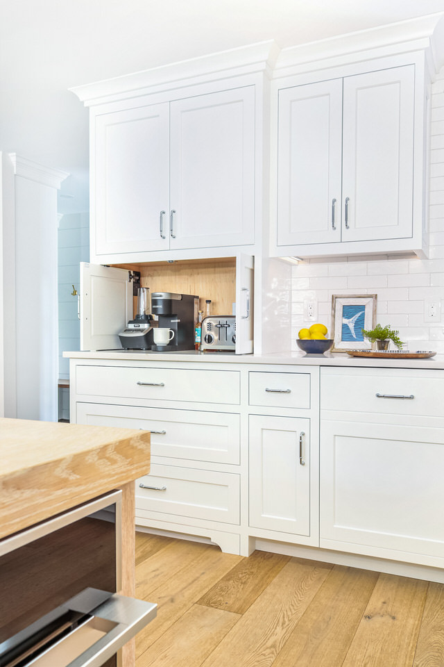 A hidden coffee station area in the kitchen, concealed behind garage-style doors, is a clever design that combines functionality and aesthetics. The surrounding cabinets provide ample storage for mugs, coffee, etc.