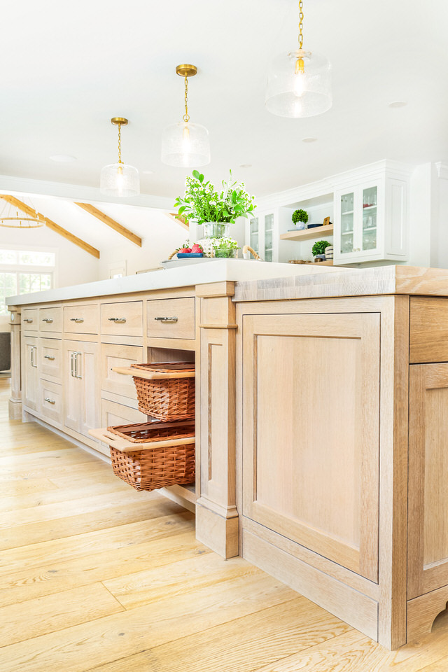 Under the island storage maximizes space by utilizing the often overlooked area beneath the kitchen island, providing valuable storage options without sacrificing floor space. This allows for easy organization of items like holiday dishes or flower vases clearing up valuable cabinet space for more everyday items.