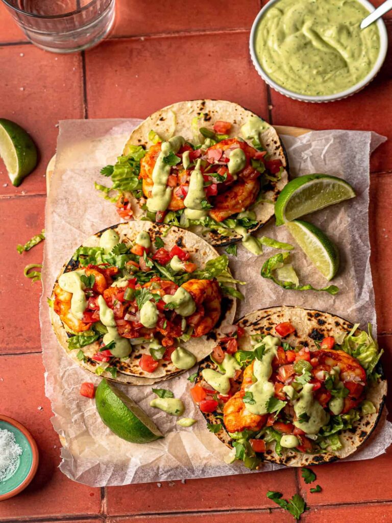 - Assemble the tacos by adding the lettuce to a tortilla, top with 4-5 shrimp then some pico de gallo and drizzle with the crema.