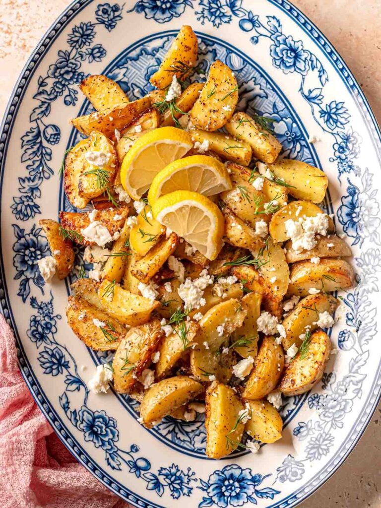 The perfect side dish does exist. These Greek Lemon Potatoes are roasted to golden perfection with a crisp exterior and fluffy interior. Coated in fresh lemon juice, garlic powder, and dill, each bite is full of zesty, herby flavor. Topped with creamy, salty feta, they’re a dish everyone will want seconds of.