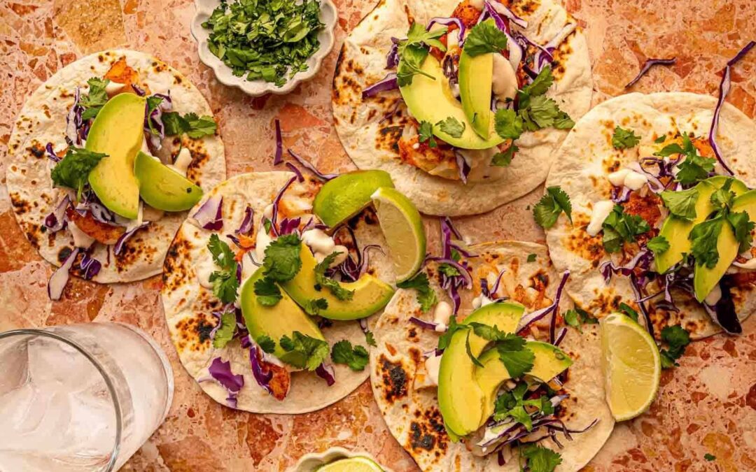 - Assemble the tacos by adding the fish to a tortilla, top with cabbage then diced avocado and drizzle with the taco sauce.